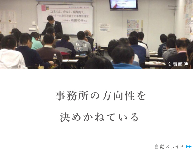 ご挨拶とお知らせ 2026年1月1日 新年あけましておめでとうございます。今月も、誠意をもってミーティングに臨みます。本日時点、一事務所様のみ新規会員の受付をしております。すぐにお申し込みでも結構ですが、お試しミーティングの上での会員申込みをおすすめしています(お申し込みやお試しご予約はこちら) サービス内容、ご相談方法など ご相談のカタチ スポットミーティング 定例ミーティング 会費、ご相談費用 お試しミーティング(オンライン) お問い合わせ・お試しミーティング 予約 研修(もしくは勉強会)開始 想いやFAQなど サポートの理由(本音) ご質問と回答(FAQ) お受けできないケース お試しミーティング お試しミーティング(オンライン) プロフィール 崎田 和伸プロフィール 講演、講師、出演 メディア掲載 崎田コラム更新 事例 ご相談事例 詳細解説 事例(行政書士事務所 開業5年目の先生) 事例(司法書士事務所 開業10年目の先生) 事例(弁護士事務所 開業3年目の先生) コラム更新中です^^ 士業・コンサルタントLINEスタンプ Quora回答者として活動しています