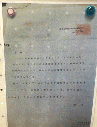 ちなみに、この時に融資を申し込んで断られた書面はこちらです。